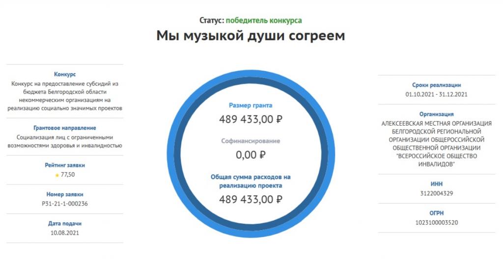 По результатам регионального конкурса на предоставление субсидий некоммерческим организациям Белгородской области на реализацию социально-значимых проектов Алексеевская местная организация «Всероссийское общество инвалидов» стала одним из победителей с проектом «Мы музыкой души согреем».